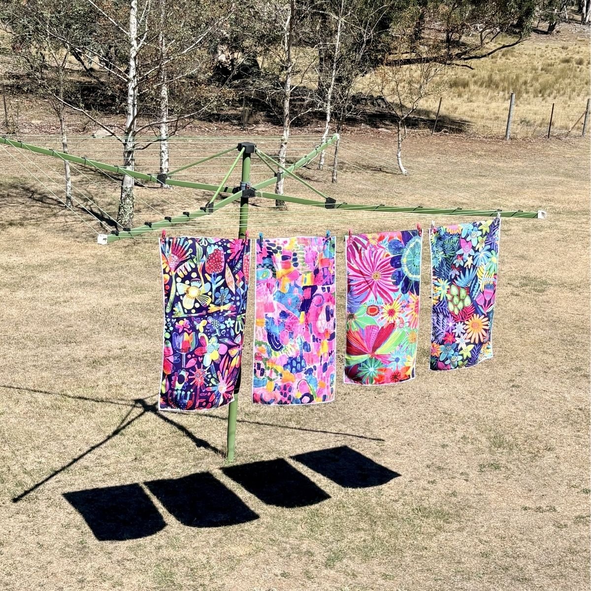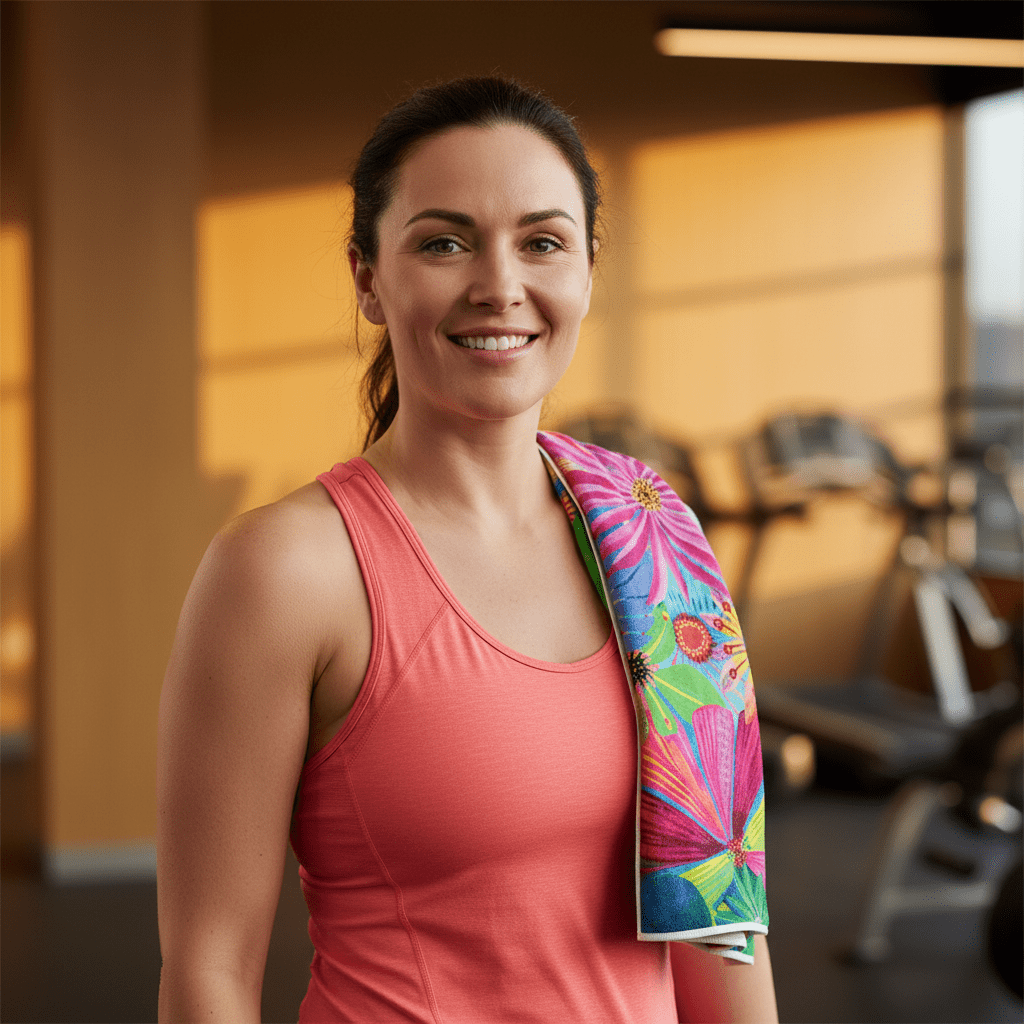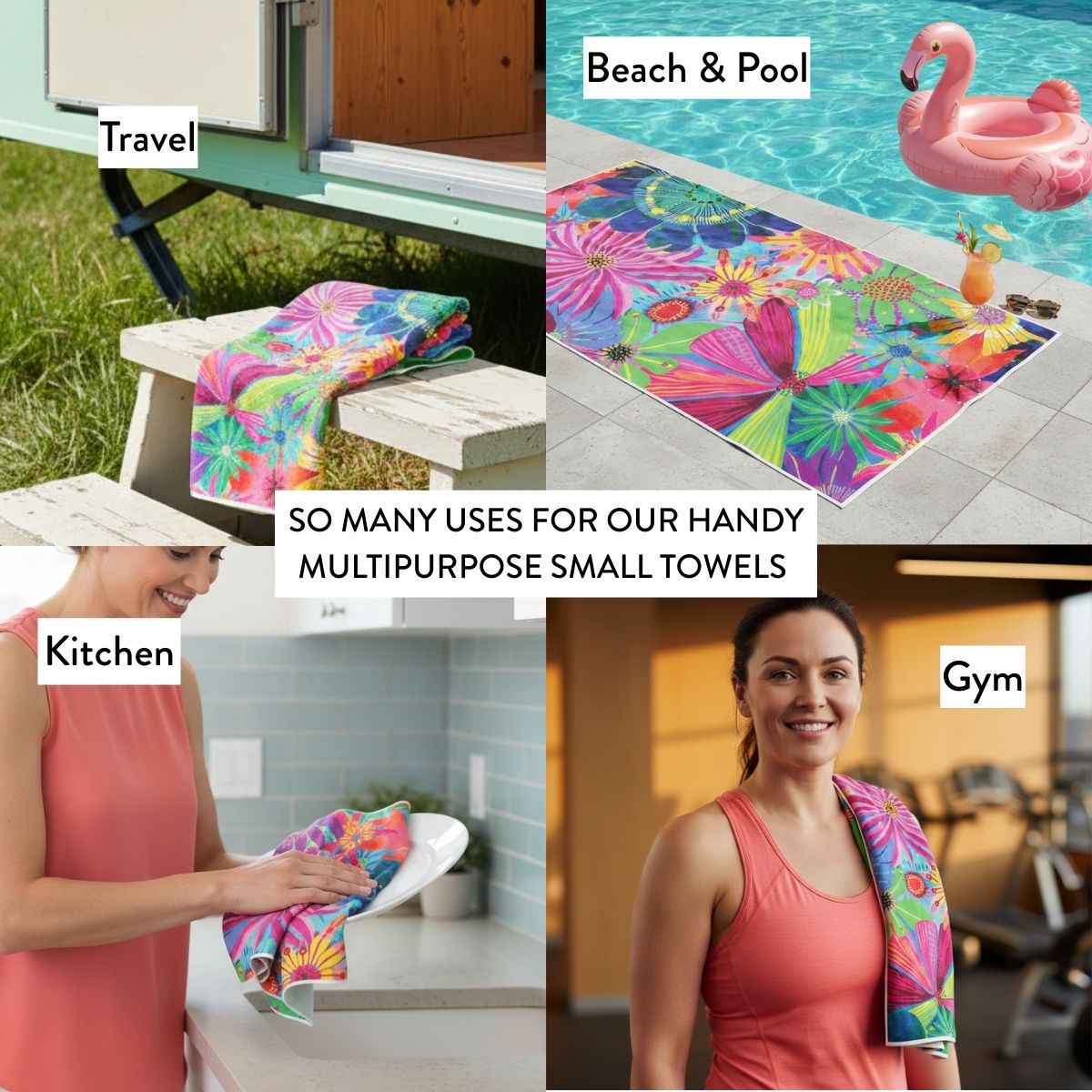 Crafted with recycled water bottles and designed with love, it's soft, quick-drying, and full of good vibes. Whether you're sweating it out at the gym, heading to the beach, muddling in the kitchen or drying off after a dip, this towel brings a pop of painted paradise to every moment.